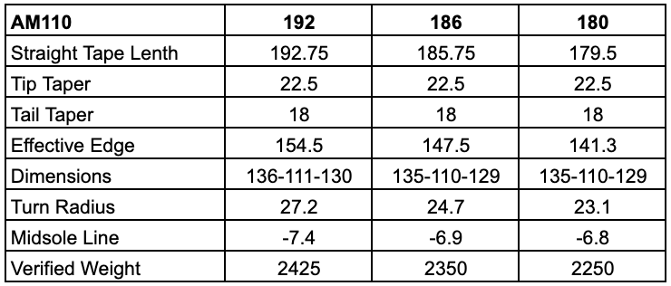 Featuring a subtle yet clearly defined camber pocket, progressive tip and tail rocker profile, the AM110 brings pop and responsiveness to its ride. The AM110 is a clear step above in terms of stability and versatility across a huge range of snow conditions, and adds a rewarding firm snow performance to its winning soft snow character.